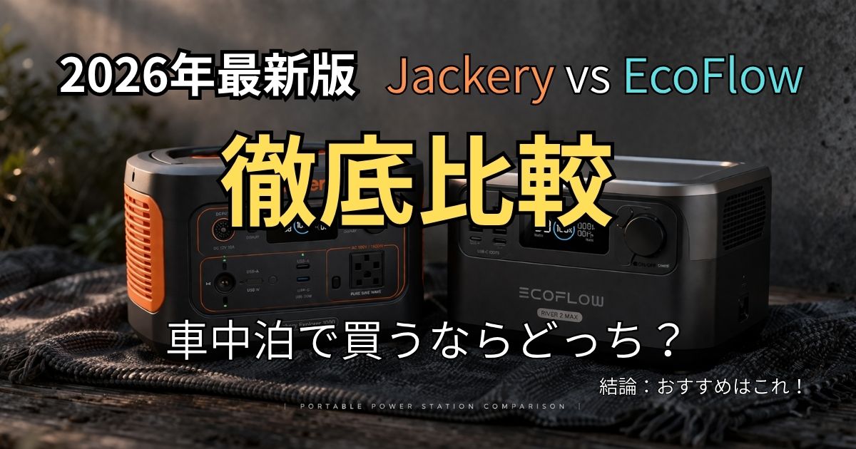 車中泊ポータブル電源の二大ブランド、EcoFlowとJackery。どちらも2026年時点でリン酸鉄バッテリーを主力採用しており、品質面の差は縮まっています。それでも特性は異なるため、用途で選ぶことが大切です。